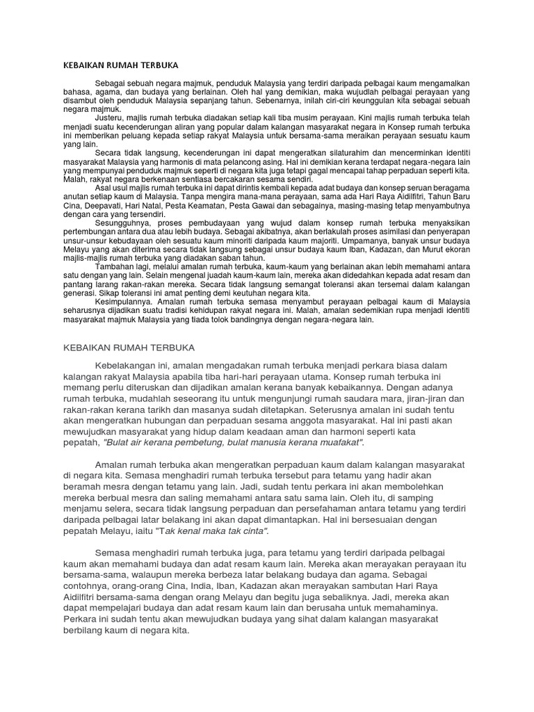 Kesungguhan kerajaan menganjurkan rumah terbuka pada peringkat nasional ini telah menjadikannya sebuah acara yang paling ditunggu-tunggu oleh setiap lapisan masyarakat di Malaysia secara amnya. Karangan Contoh Kebelakangan ini amalan mengadakan rumah terbuka menjadi perkara biasa dalam kalangan rakyat Malaysia apabila tiba hari-hari perayaan utama. Amalan rumah terbuka sudah menjadi lumrah untuk sambutan perayaan di negara ini termasuk hari raya aidilfitri deepavali tahun baru cina.